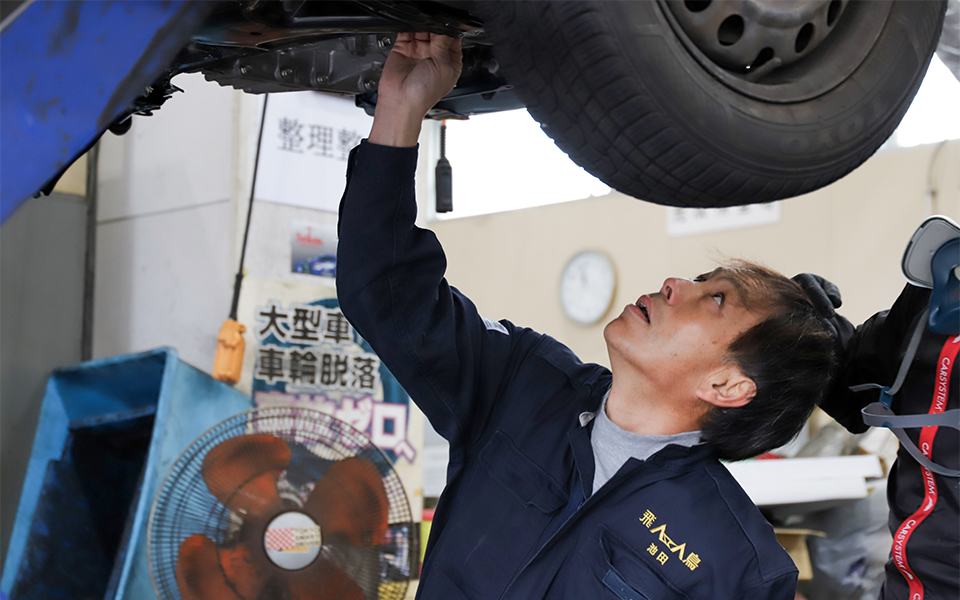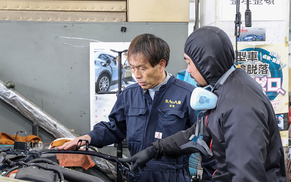 いま自動車業界というのは昔と違いまして、コンピューターを使った整備などが多いのですが、当社ではそれも含めて、エンジンや配線等の修理、業種によっては鈑金の大きい修理、フレーム修理も含めて、色々なことが経験できる職場となっています。