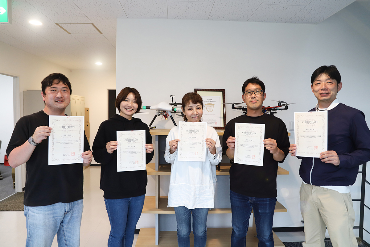 〇JUIDA認定のライセンス「無人航空機操縦技能証明証」を取得した受講生(真ん中に芳本美代子さん)