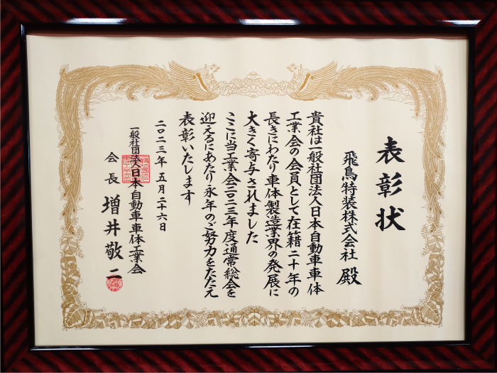 飛鳥特装株式会社 | 永年在籍会員表彰のお知らせ(日本自動車車体工業会)