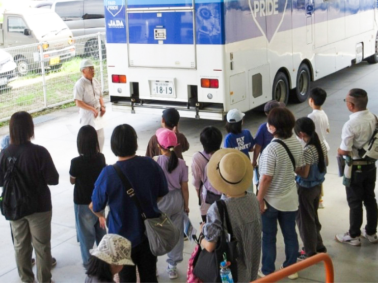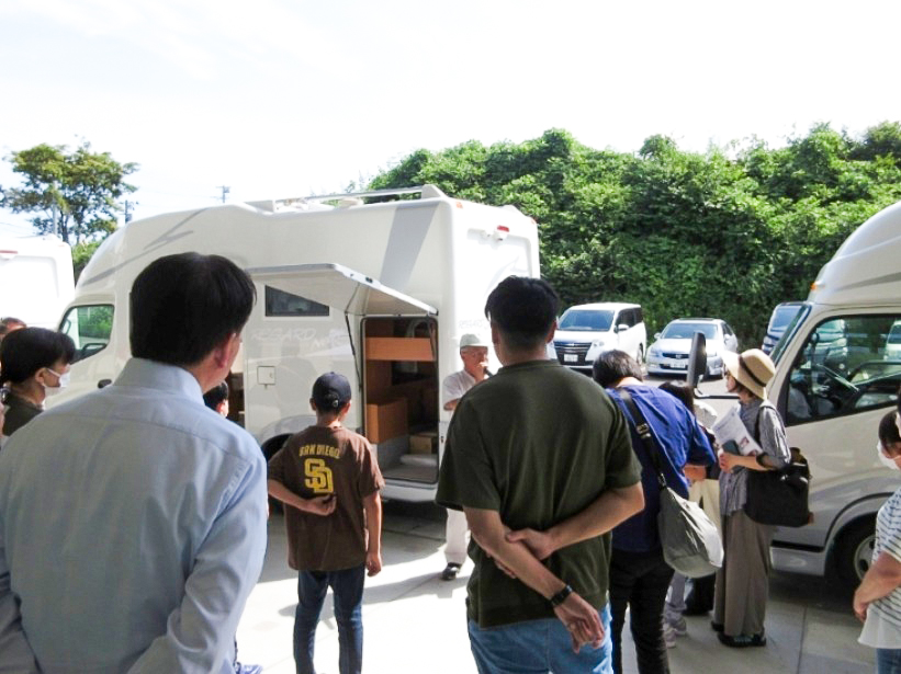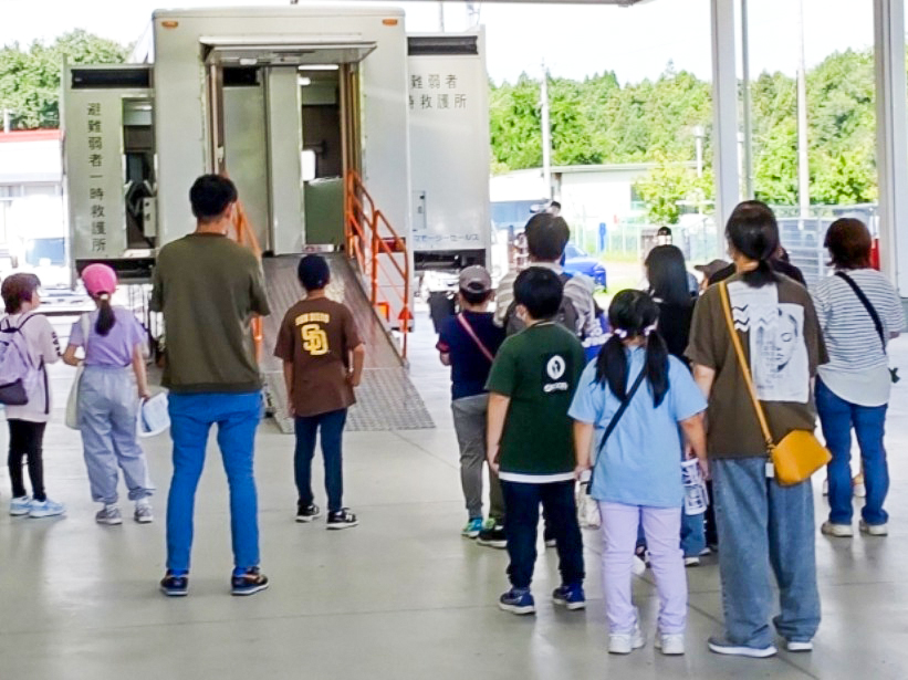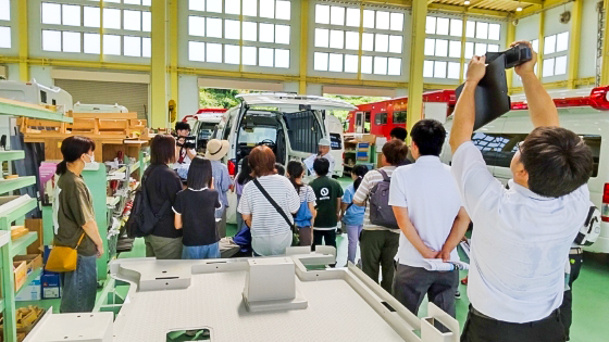 見学では、YMSが製造を行っているキャンピングカー「レガード」や、能登半島沖地震の際に無償貸与された両側拡幅トレーラー「避難弱者一時避難所」、高規格救急自動車「C-CABIN」、消防隊の活動を支援する「拠点機能形成車」の内部などをご覧いただき、実際にどのような特種車両の製造を行っているのか体感していただきました。また、最大安定傾斜角度試験の実演も行い、YMSが取り扱う実際の製品や行っている作業に触れていただきました。