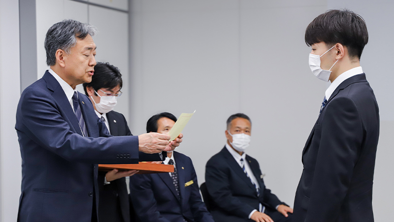 式典では、代表取締役・川野より歓迎の辞が述べられ、続いて内定者一人ひとりへ証書を授与。その後は懇親を兼ねた研修を実施し、内定者同士が交流を深める場となりました。