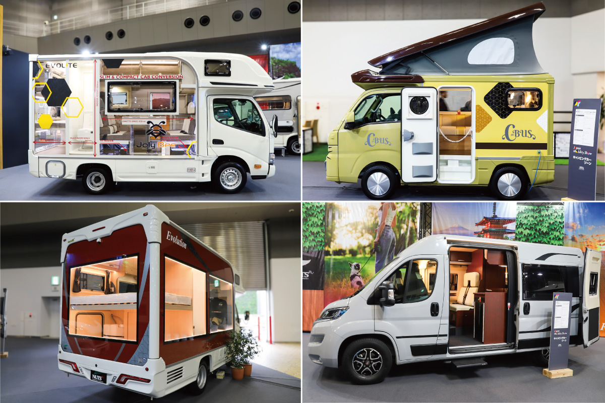 かつての名車と最新モデルが並ぶことで、キャンピングカーの「過去から未来への進化」を感じさせる展示構成となっています。