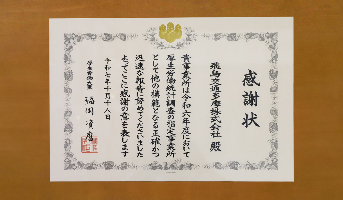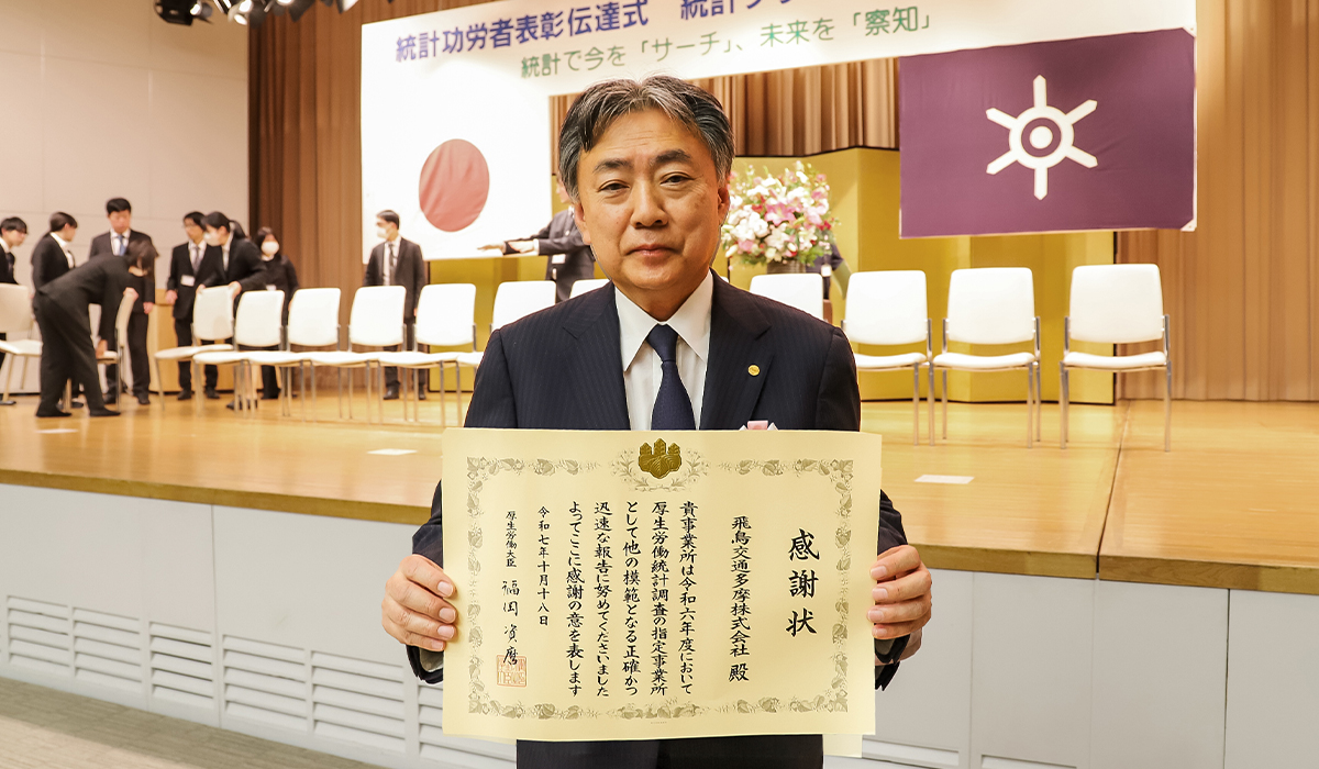 飛鳥交通多摩株式会社|令和7年度 東京都統計功労者表彰伝達式にて「厚生労働大臣感謝状」を受賞