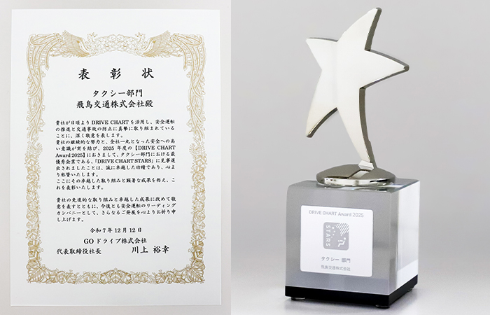 飛鳥交通株式会社|「DRIVE CHART Award 2025」においてタクシー部門「DRIVE CHART STARS」に選出
