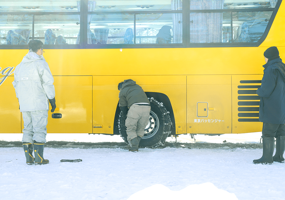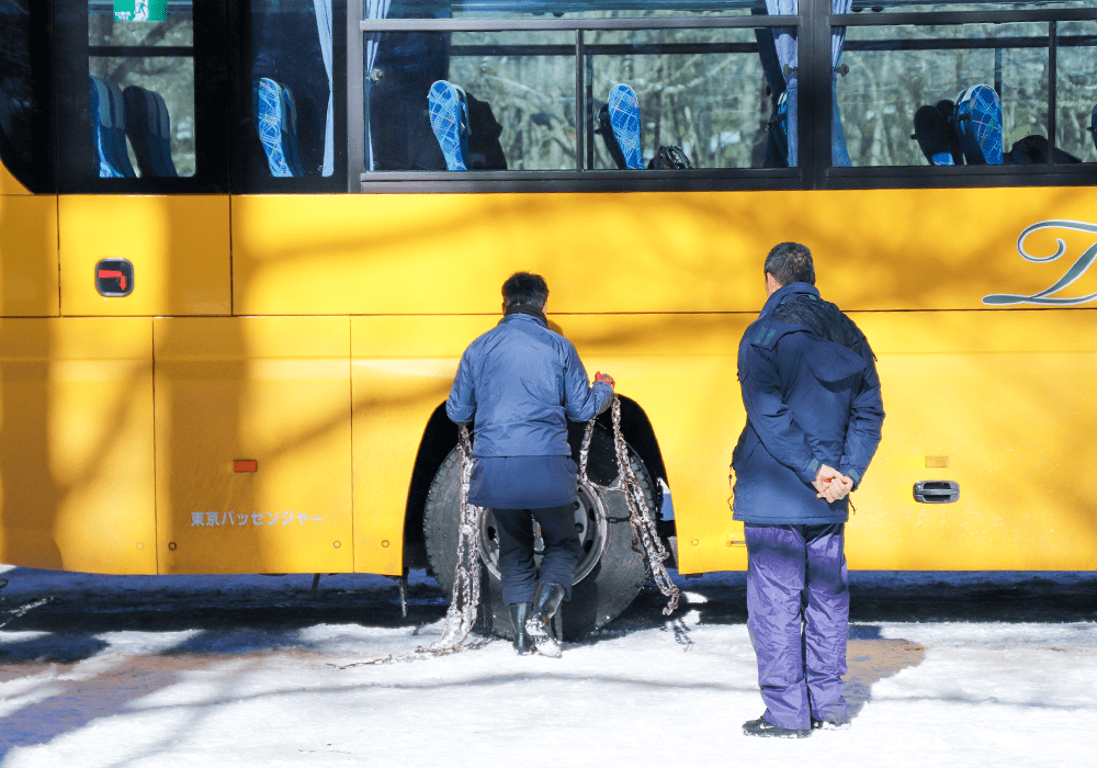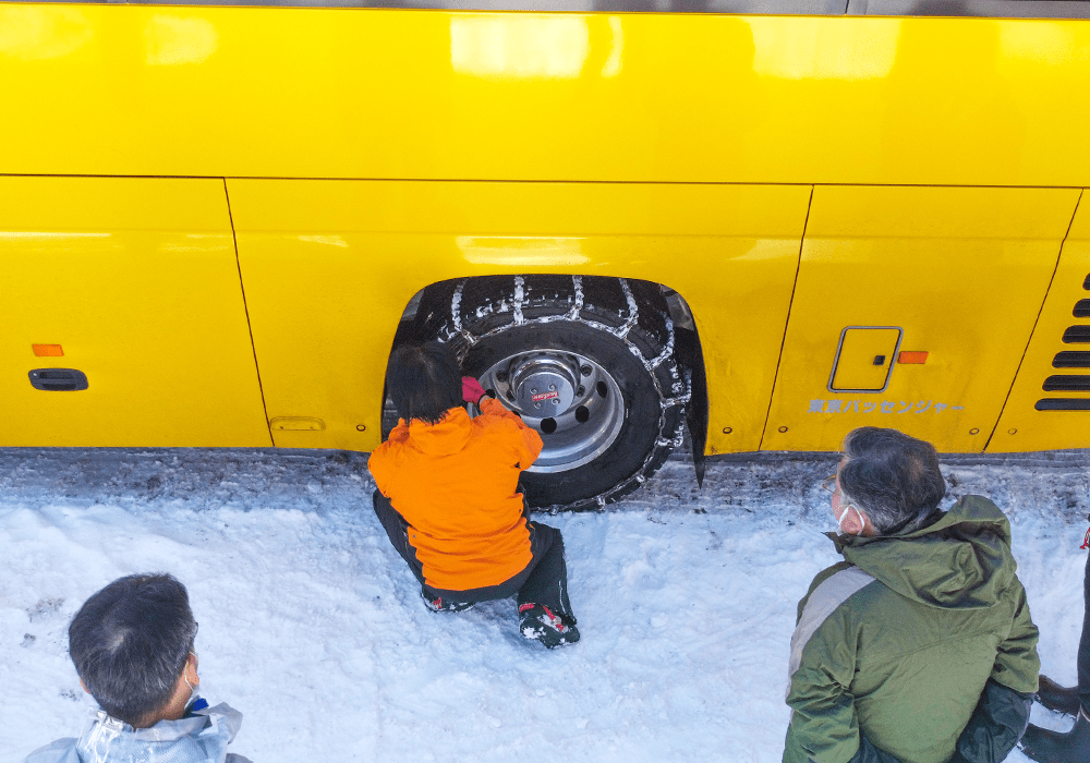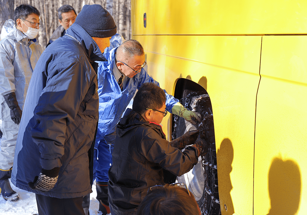 同行した指導運転士の指導のもと、様々なことを想定しながらタイヤチェーンの脱着訓練を行います。