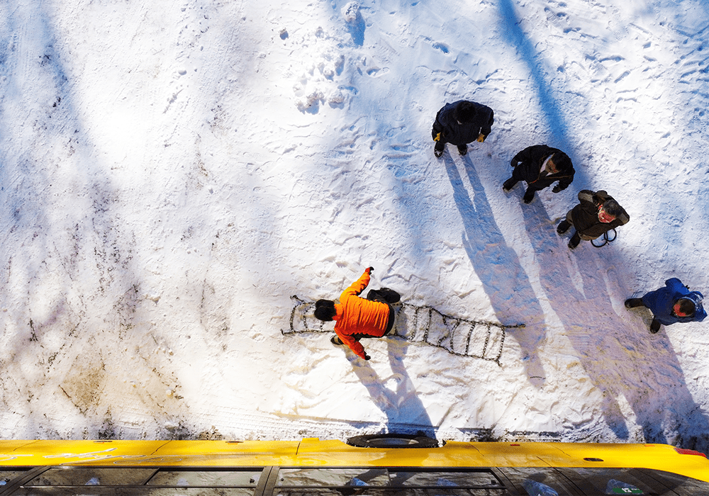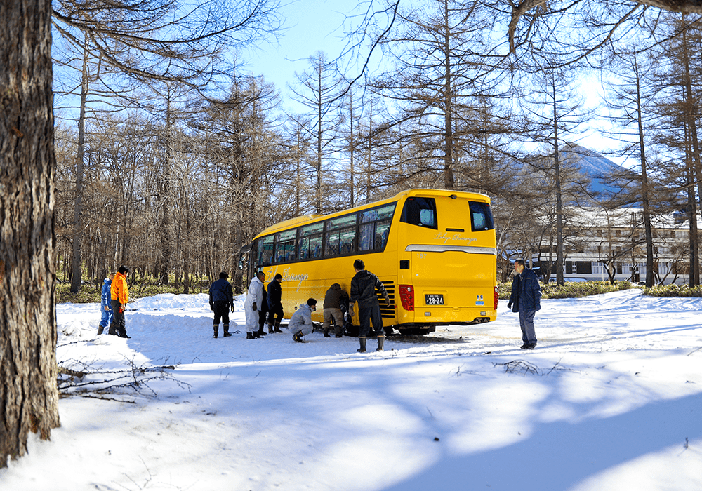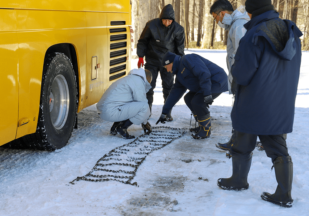 「雪山研修」とは、例年冬季に積雪の多い地域に出向き、雪道での安全な走行訓練及びタイヤチェーン脱着の技術向上を目的としております。