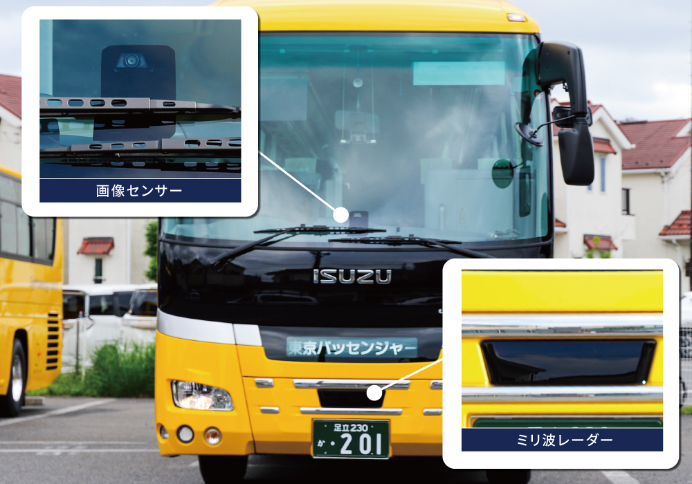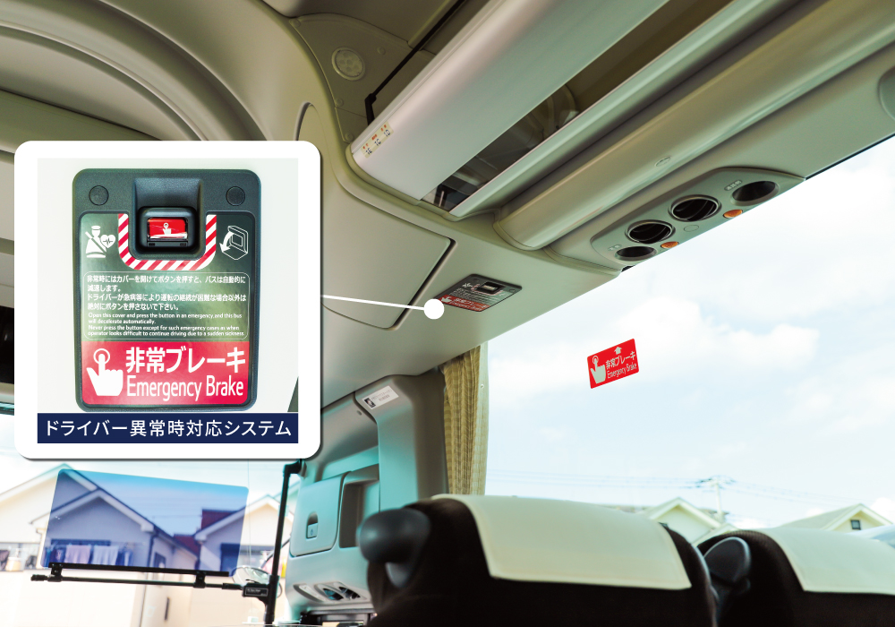 万が一、ドライバーに急病等の異常が発生した際、自らが運転席のスイッチを押すか、もしくはお客様が最前列客席上部に設置されたスイッチを押すことで、車両のシステムがクラクションとハザードランプを発動させ、ゆっくりと制動を開始し停車いたします。