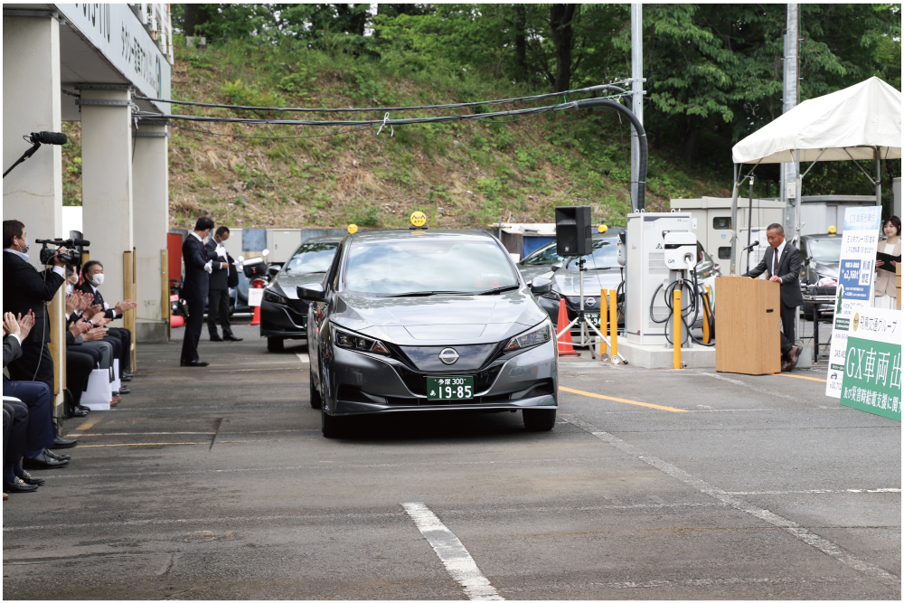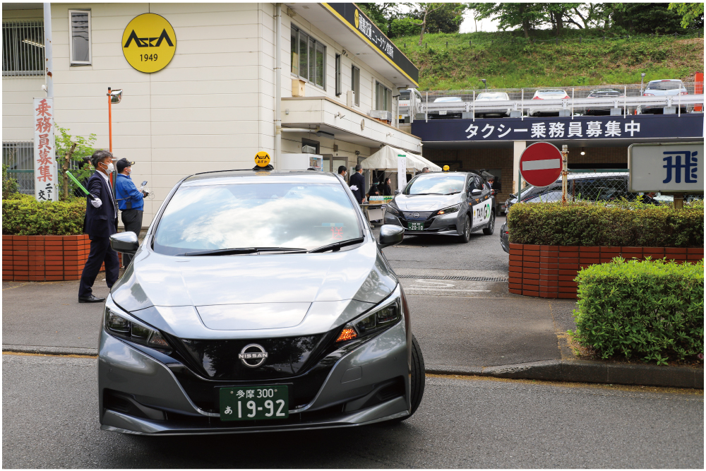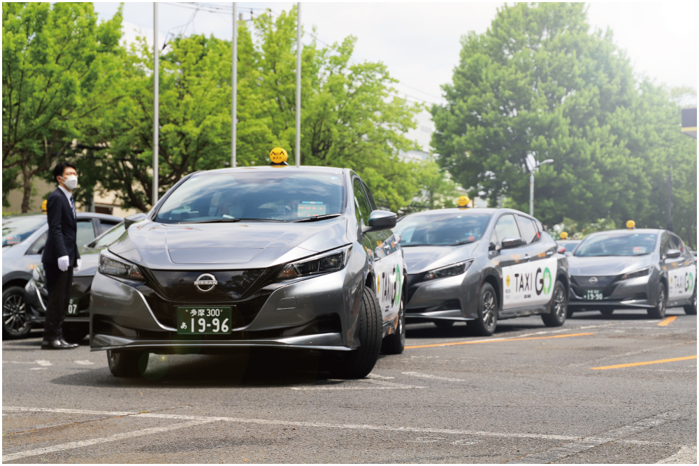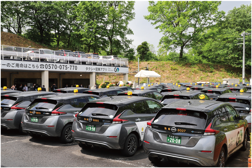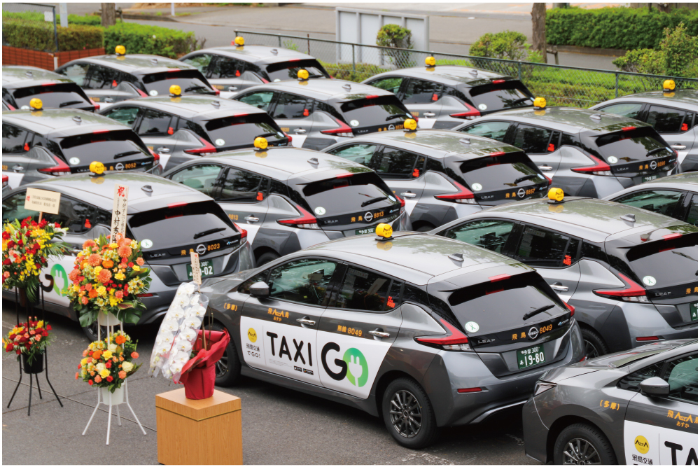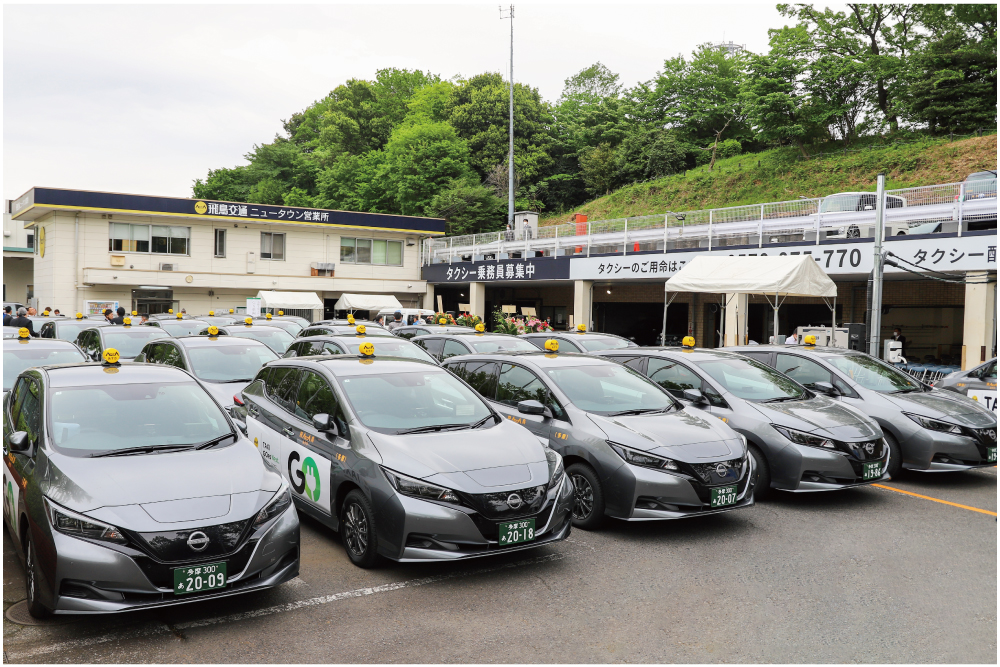 東京多摩地区で60台、神奈川地区で50台、埼玉地区で70台、合計で180台の日産リーフをタクシーとして今夏までに導入します。1日には多摩地区・町田地区のタクシー40台を集結させ、駆け付けて頂いた来賓によるテープカットセレモニーを行い、EVタクシーによる営業を開始しました。