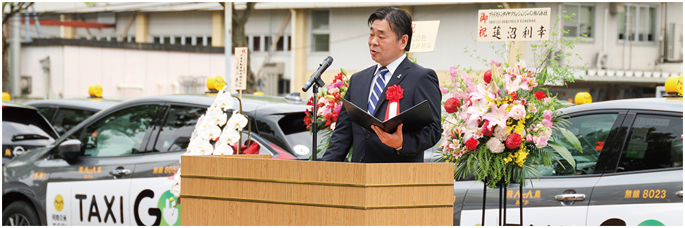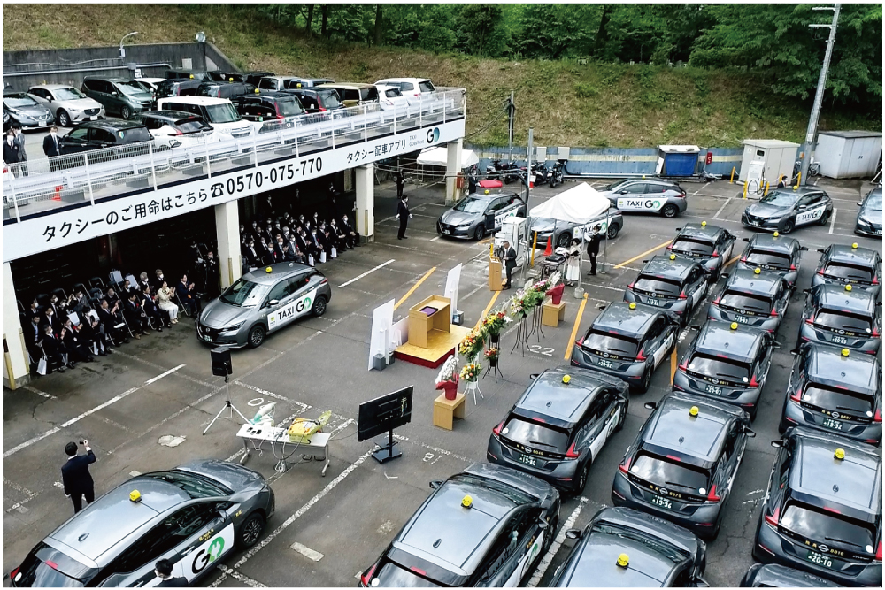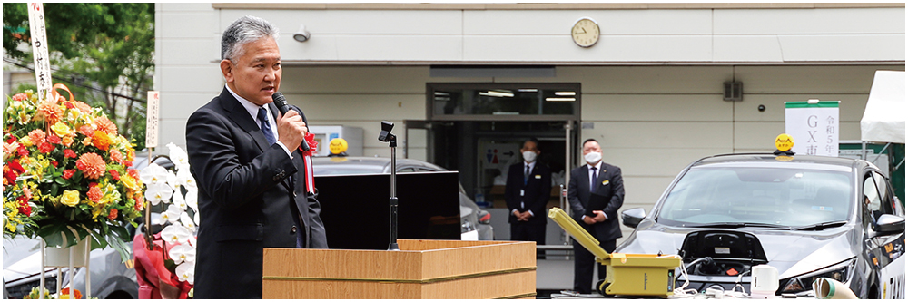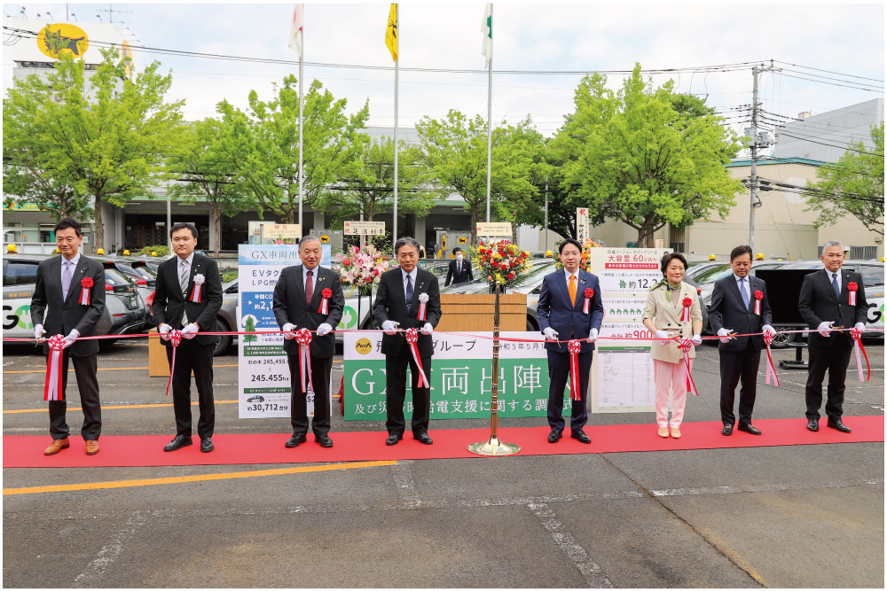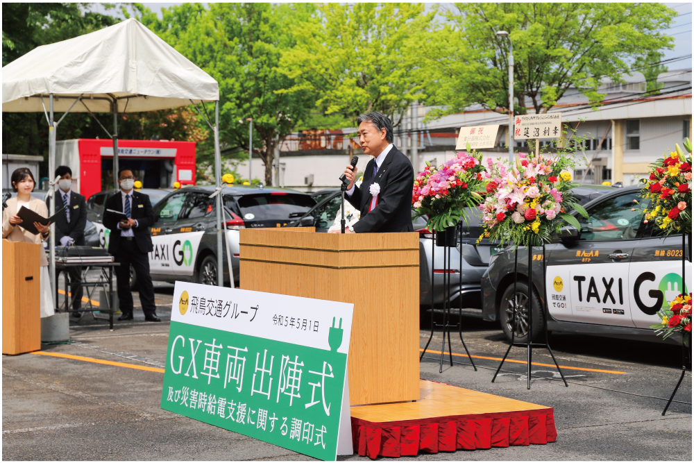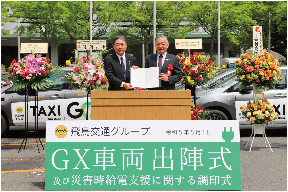 飛鳥交通グループは5月1日、飛鳥交通ニュータウン株式会社(多摩市)において、「GX車両出陣式及び災害時給電支援に関する調印式」を挙行しました。公共交通機関であるタクシーの一定数を電気自動車とすることで、環境に配慮しつつ、大規模災害時等による停電時に、地元自治体と連携して避難所等で電力供給できる仕組みを構築します。