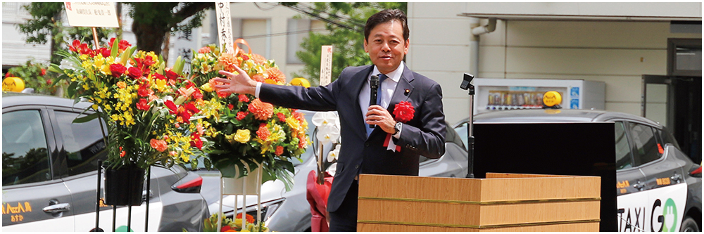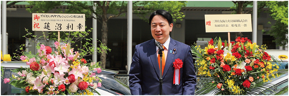 来賓には、こども家庭庁初代担当大臣の小倉將信衆議院議員、環境副大臣の山田美樹衆議院議員、衆議院文部科学委員長の宮内秀樹衆議院議員、中田宏参議院議員、阿部裕行多摩市長ら多数に臨席頂いて、タクシーの脱炭素化に向けて激励のお言葉を頂戴しました。