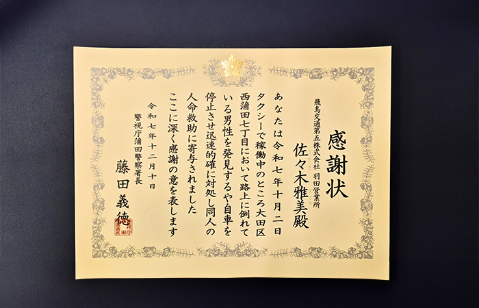 このたび、飛鳥交通第五株式会社 羽田営業所の佐々木雅美乗務員が、警視庁蒲田警察署長より表彰されましたのでお知らせいたします。