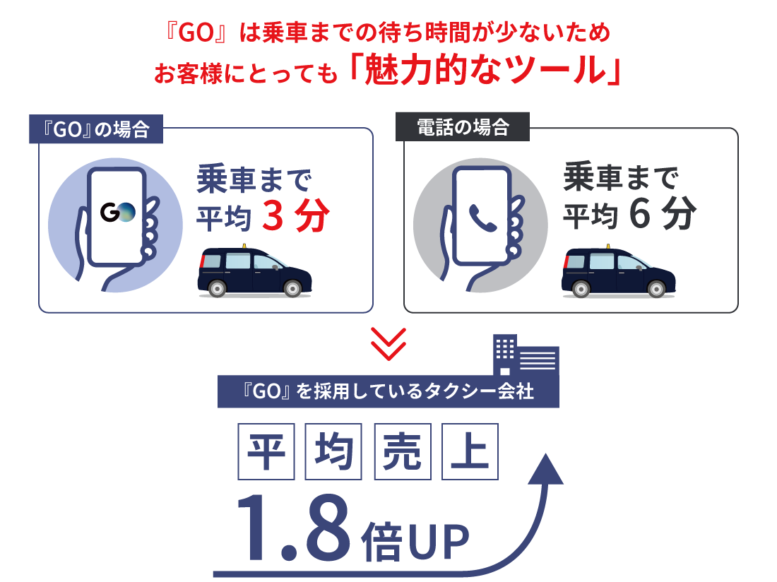 『GO』は、タクシーを呼んでから乗車するまでの時間が平均3分と、電話で呼ぶより半分の時間で乗車できることが 魅力の1つになっています。 こうした便利さがタクシー会社側にも大きなメリットを呼び 『GO』を採用しているタクシー会社の売り上げも平均1.8倍ほど伸びています。