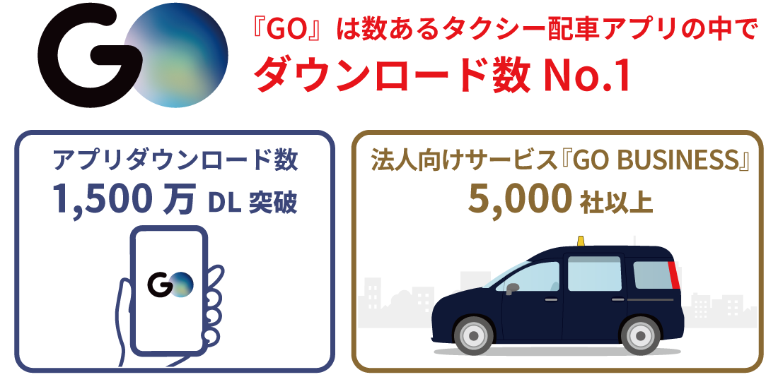 『GO』はGO株式会社が運営するダウンロード数No1を誇るタクシー配車アプリで、累計ダウンロード数は1,500万を突破。